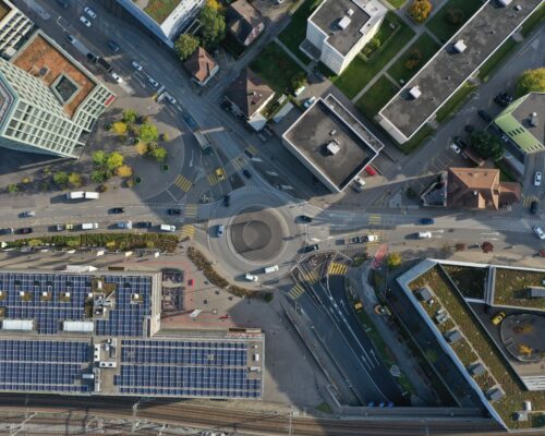 Drohnenaufnahmen zur Auswertung des Verkehrsverhaltens beim Kreisel Gais in Aarau.